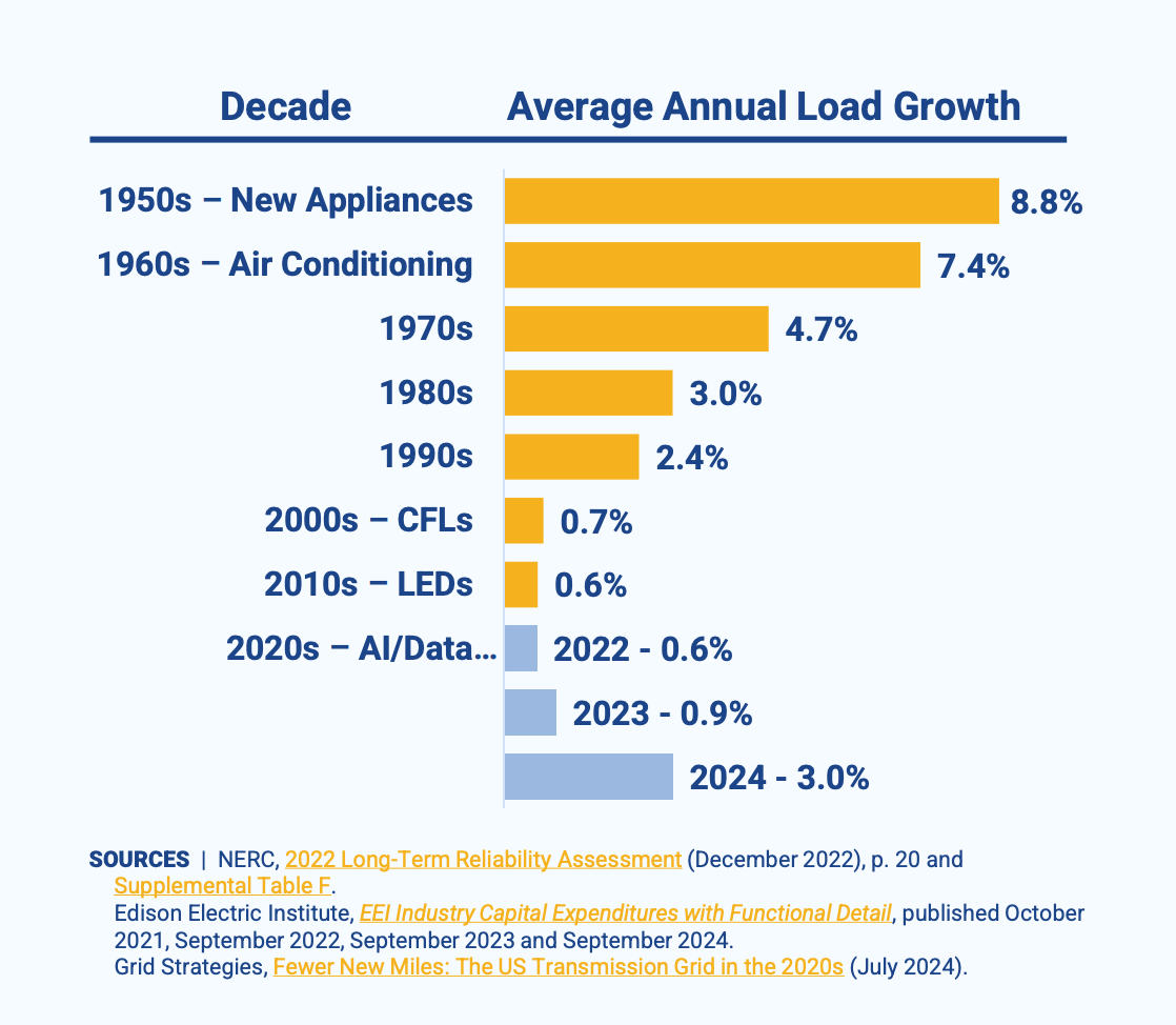 (This chart from Grid Strategies shows the change in U.S. power demands since the 1950s)