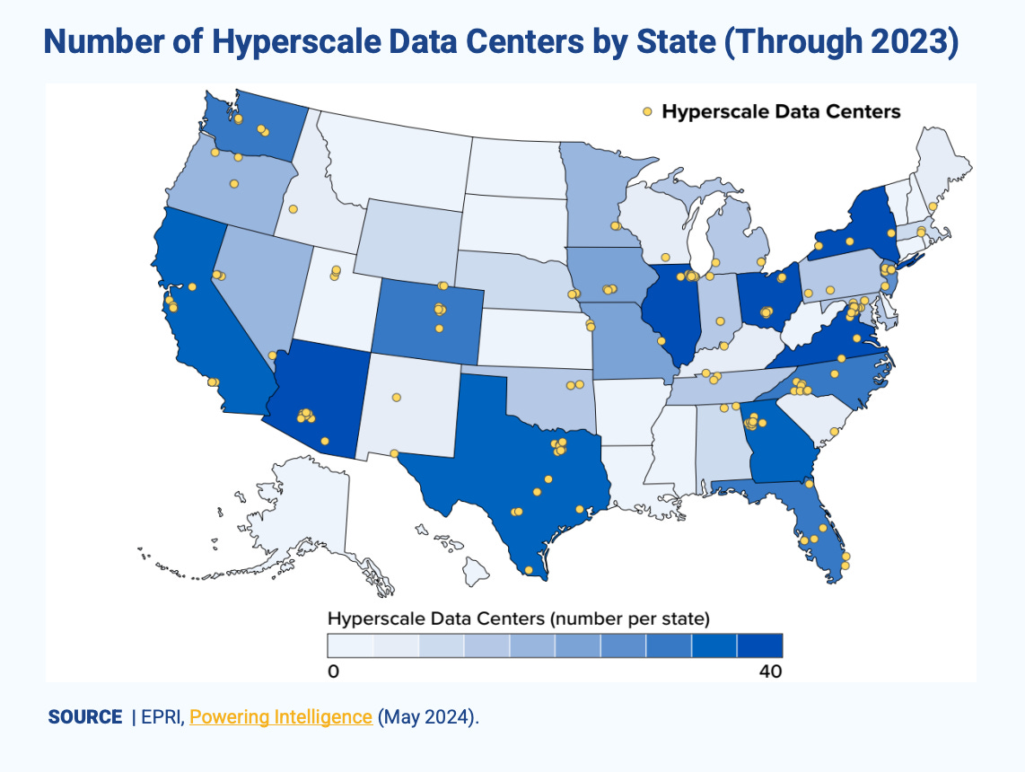 A single hyperscale data center can draw 100–500 MW—enough to power a mid-sized city.