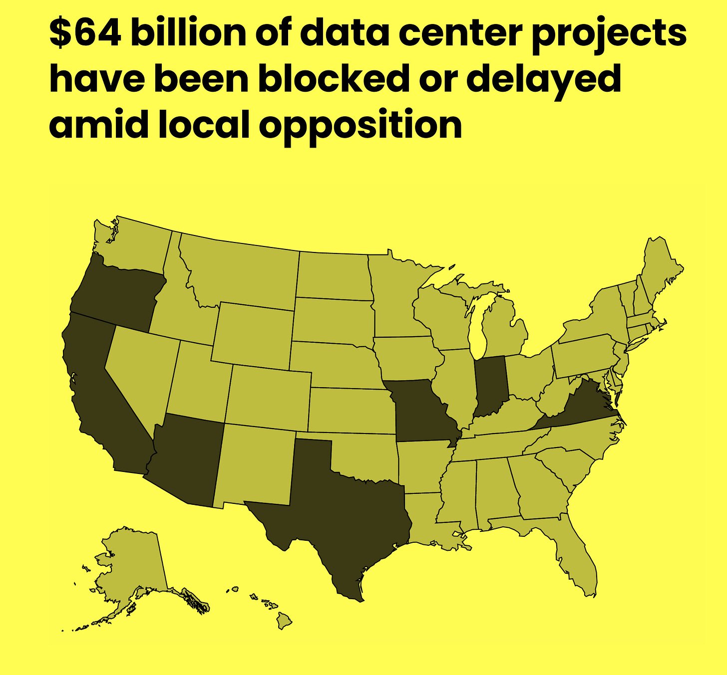 A report from Data Center Watch says: $64 billion in U.S. data center projects have been blocked or delayed by a growing wave of local, bipartisan opposition.