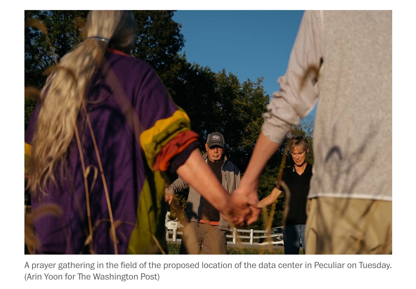 In Peculiar, Missouri, more than 1,000 locals joined a Facebook group called Don’t Dump Data on Peculiar. They rallied, showed up in force. They held prayer circles at the proposed site. City leaders reversed their earlier zoning approval.